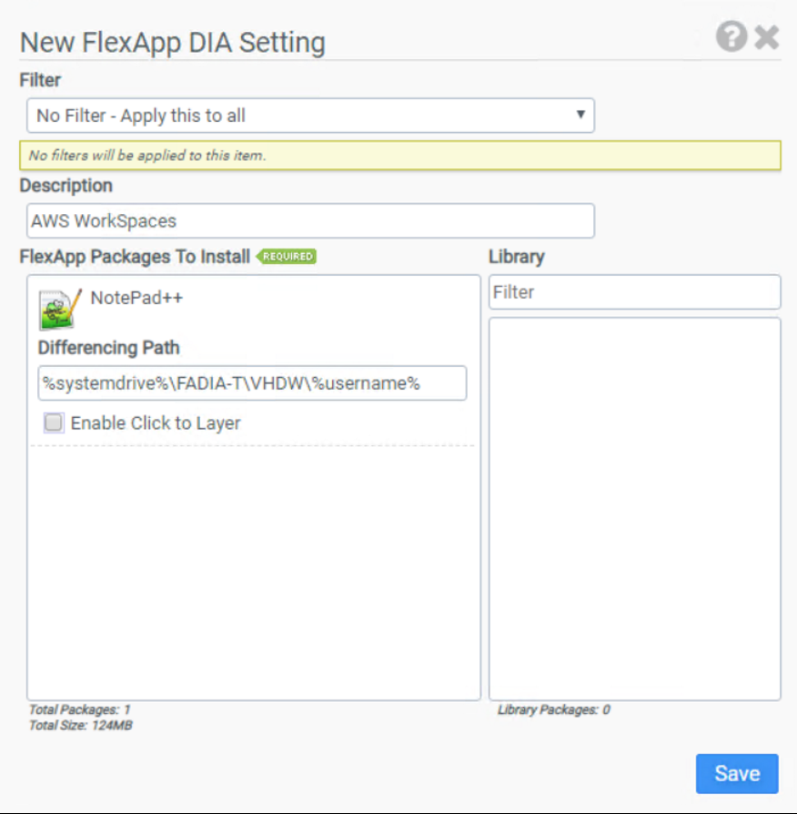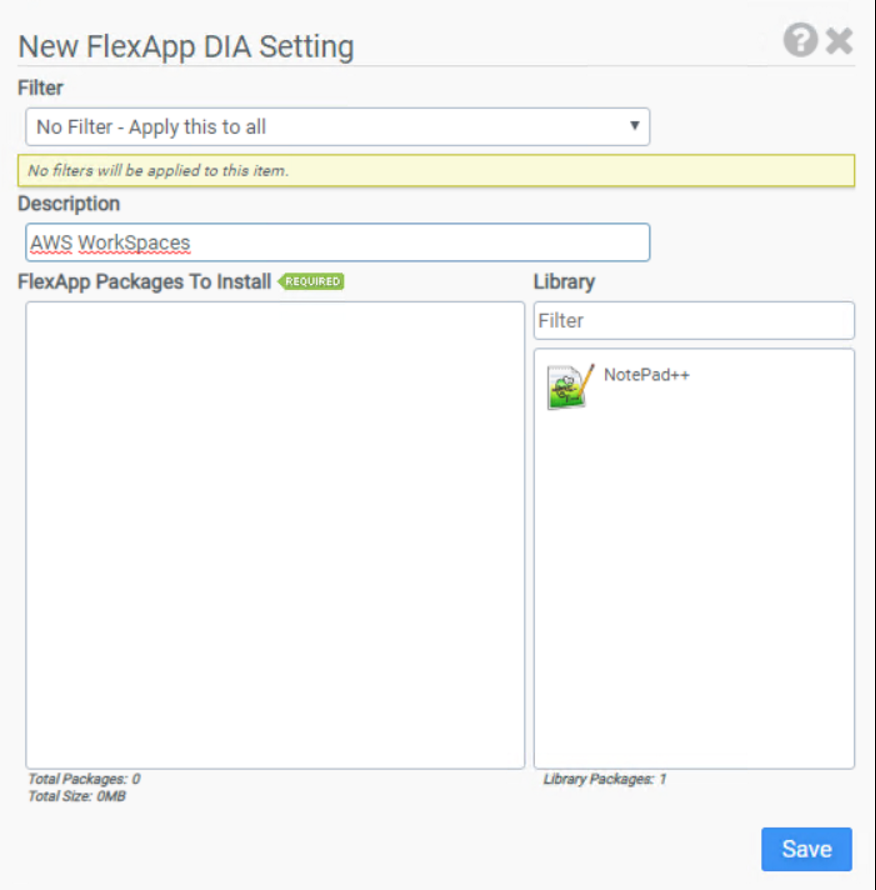 - On the New FlexApp DIA Setting screen, drag the FlexApp package you wish to publish from the Library to the FlexApp Packages to Install box and click Save.